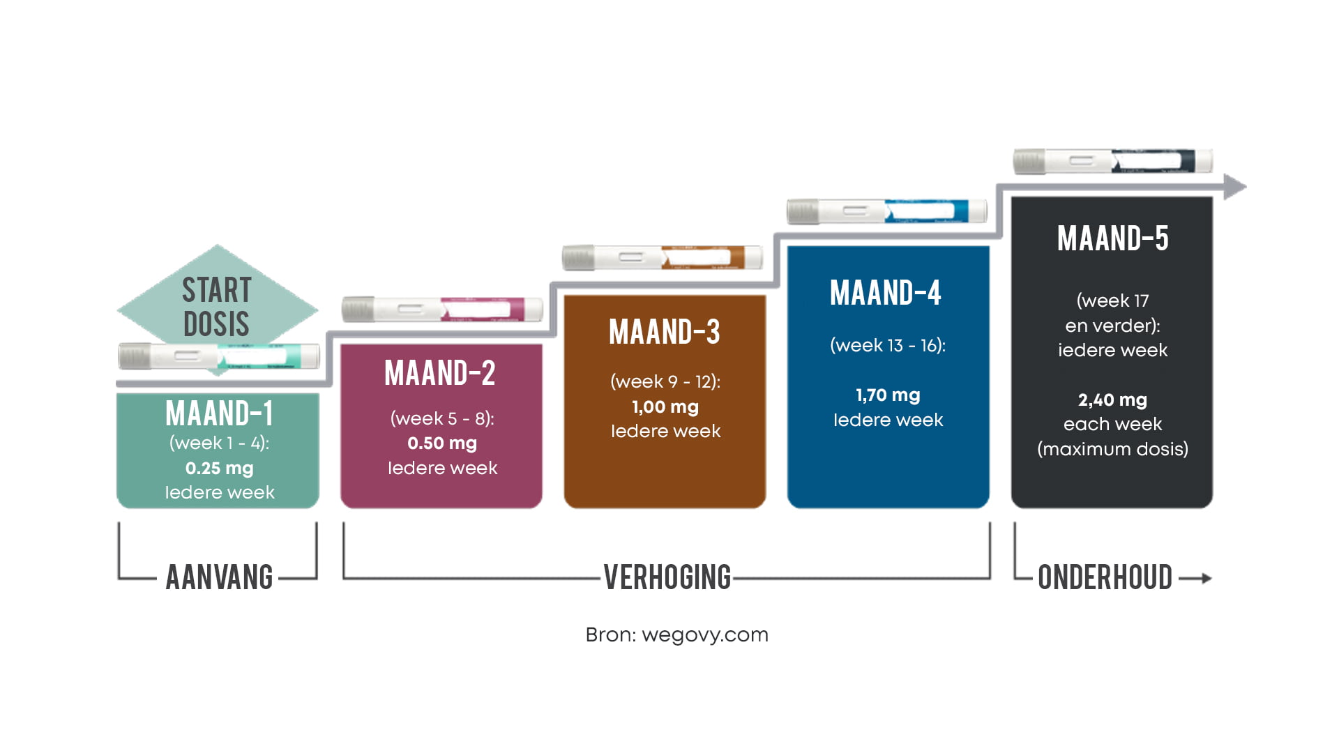 - Doorgaans is de startdosering 0,25 mg per dag. Zo went het lichaam aan de behandeling en kan ook bekeken worden of er bijwerkingen optreden. De dosering dient vervolgens wekelijks opgehoogd te worden, tot een maximale dosering van 2,4 mg (onderhoudsdosis). Dit duurt meestal zeventien weken. (Bron: novo-pi.com/wegovy)